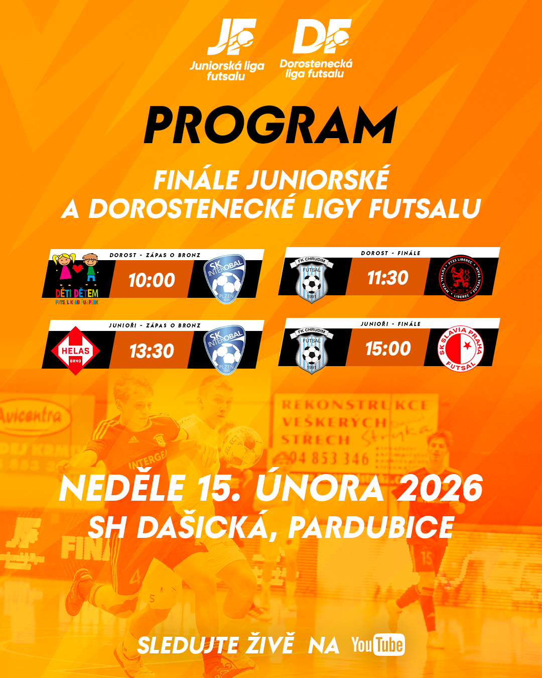 Velké finále Juniorské ligy futsalu je tady! Vítěz východu proti vítězi západu. FK Chrudim bude obhajovat titul proti Slavii Praha. V nedělním finálovém dni v pardubické hale Dašická bude k vidění také souboj o bronz mezi Helasem Brno a Plzní. Oba zápasy uvidíte živě na YouTube Futsal Česko.